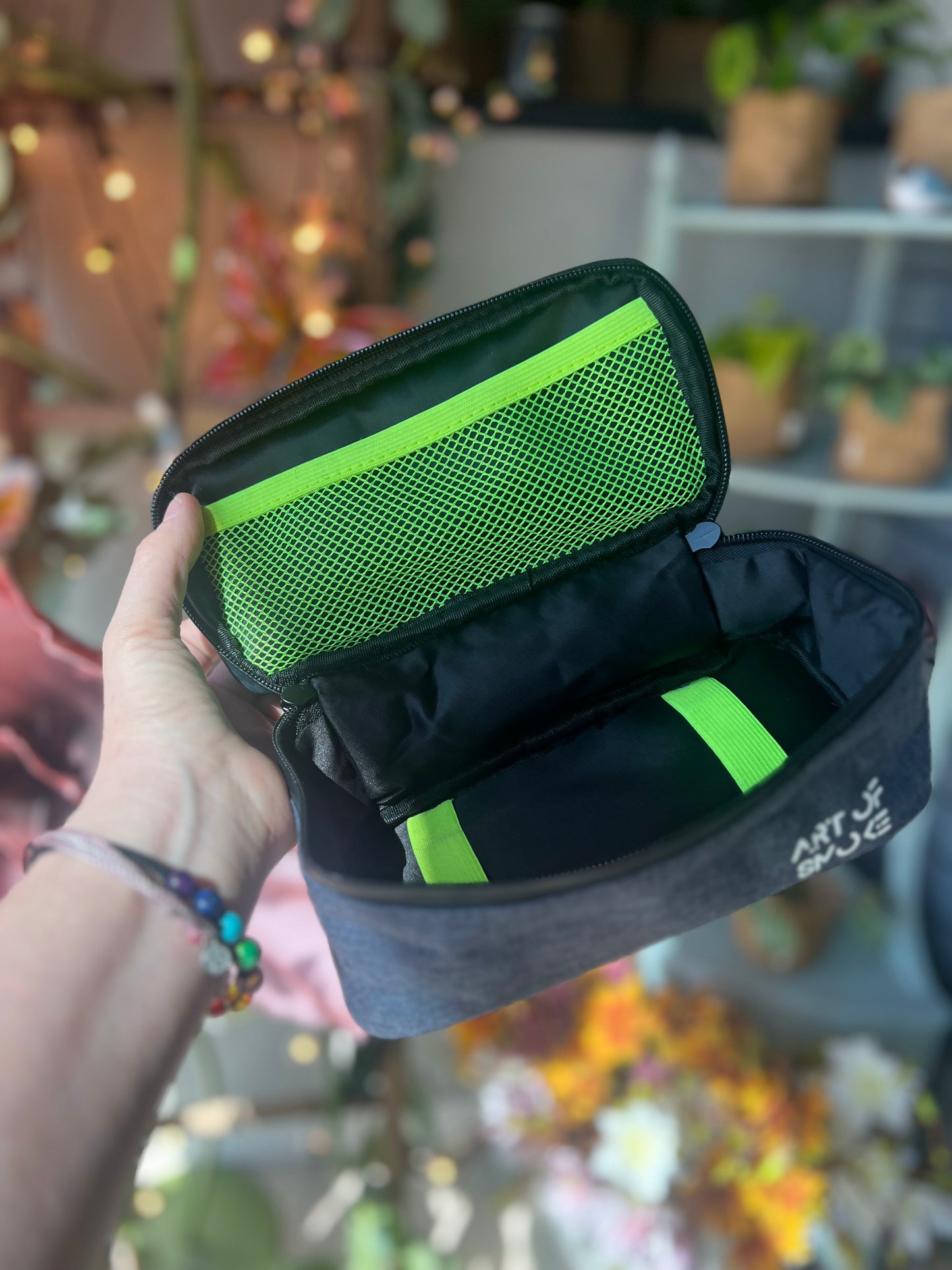 Our odor proof travel case is ideal for medical and dispensary items. Case also features a handle for easy carry and interior velcro and a mesh pocket including the perfect sized “in the trees” rolling tray. Featuring built in odor proof technology, this zippered case features an activated charcoal lined interior which helps eliminate any odors or scents. Carry this case discreetly anywhere and keep your goods fresh and unnoticeable. 8.25” x 4” x 4”